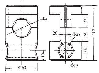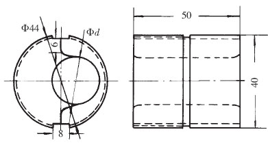 该压圆模用于压接多根电缆线。由于引线中选取的电缆线并接根数不同,其排列后截面形状也不同(如图4),选择连接管时按其总截面选择而不按外接圆半径来选择,因此电缆线头有的不能插入连接管。据此我们设计了电缆线压圆模,把各种截面形状的电缆线都挤压成圆形。然后插入双头连接管进行引线的冷挤压焊接。电缆线压圆模如图5。