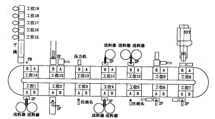 由于装配工位较多,为方便增加、调整工位及处理装配中的突发事故,整个装配线呈环形布置。装配线分主线和子线,共设18个工位。工位2~工位13是主线上的工位。工位15~19作为人工子装配线,布置在环形的首尾两端。整个装配线的线体布置简图如图5所示。