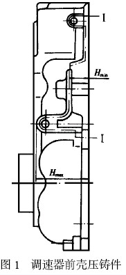 图1 是汽车-油泵调速器前壳压铸件示意图, Ⅰ- Ⅰ分型面需用抽芯才能完成脱模,其最低抽芯高度Hmin 为17mm, 最大抽芯高度Hmax为45mm, 为了保证滑块有足够的退位空间而不发生自锁, 滑块的高度必须大于或等于45mm。为避免抽芯距离过大造成滑块体积增加, 在设计中采用了局部增高多级锁紧结构,如图2 所示。P 是高于17mm低于45mm的面,N是高于45mm的面,M面是与N面同高且保证N 面受力平衡的辅助结构。α为抽芯角,β1 、β2 为锁紧角,β1 、β2 不仅具有锁紧作用,而且在开模抽芯时还具有让位的作用,所以β1 、β2 必须大于α, 而且β2 应大于β1 , 否则开模时, 滑块会出现自锁。锁紧角β2 也可以等于β1 , 但由于制造时有误差, 如果误差大, 则β1和β2 形成的锁紧面会出现干涉。在压铸件调速器前壳模具设计中, α取23°, β1 取26°, β2取30°,实现了安全生产。