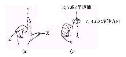 2)标准坐标系的规定 标准坐标系是一个直角坐标系,如图1(a)所示,按右手直角坐标系规定,右手的拇指、食指和中指分别代表X、Y、Z三根直角坐标轴的方向;如图1(b)所示,旋转方向按右手螺旋法则规定,四指顺着轴的旋转方向,拇指与坐标轴同方向为轴的正旋转,反之为轴的反旋转,图中A、B、C分别代表围绕X、Y、Z三根坐标轴的旋转方向。