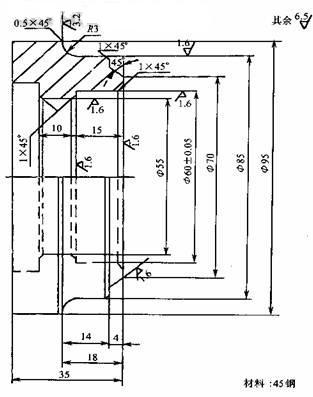 如图所示工件,该零件属于典型的盘类零件,材料为45钢,可选用圆钢为毛坯,为保证在进行数控加工时工件能可靠的定位,可在数控加工前将左侧端面、Φ95㎜外圆加工,同时将Φ55㎜内孔钻Φ53㎜孔。