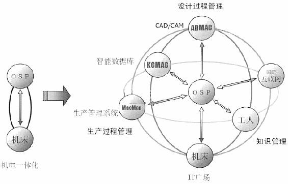 这里的“直接加工” 是一个全新的观念,其表现为,在“设计过程管理(纵轴)”上, 使得以往分散的CAD部件设计与利用CAM的工艺设计可以同时并行处理,并且将工艺设计人员的数字化加工知识具体反映在加工工序表、刀具表和加工指示图之中,利用网络瞬时正确地将这些加工信息传送给机床操作工,大大提高了以往凭手工作业和感觉的工艺设计和加工作业的精度,实现作业的高精度化和标准化。