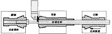 如下图所示,棒状毛坯夹持在机床上的导套上,毛坯沿导套逐渐向外送进,仅伸出当前需加工的毛坯部分,这样可最大限度地提高工件的夹持稳定性,最大限度地减少工件变形和震动,提高加工精度。