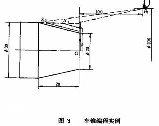 已知毛坯为φ30mm的棒料,3号刀为外圆刀,试车削成如图3所示的正锥。