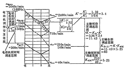 在我厂的CKA6140数控车床中,已知:主轴的最高转速为nmax=2400r/min;主轴的最低转速为nmin=40r/min;计算转速n=210r/min;调频电动机的nmax(电)=5040r/min(168Hz);调频电动机的n额(电)=1500r/min。