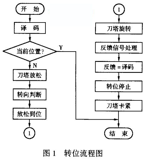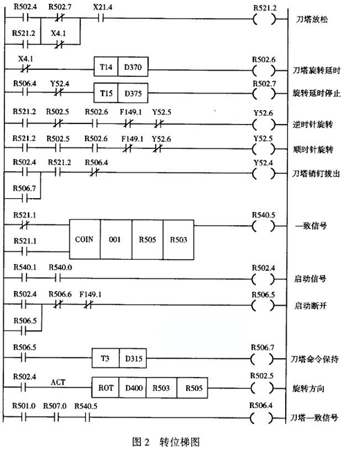 在转塔的机械结构上,为提高换刀的重复定位精度,使用了碟簧和销钉,以便使刀塔定位结束时锁紧转塔。为了提高刀塔转位的可靠性,取消了每个刀位一个开关的结构,同时在与转塔同轴的位置上安装了一个编码器,这样刀塔旋转时编码器将自动地把刀位的实际位置以BCD码的形式反馈给数控系统,大大减少了由于开关引起的误动作。图1描述了其动作过程。除结构改进之外,在PLC上也作了相应的处理,处理过程如图2所示。当数控系统中输出换刀命令时PLC首先进行译码,将译码结果放入R505中,并与寄存器R503中所保存的刀塔当前的刀位进行比较,如果比较结果相同,则R506.4置1,刀塔的位置保持不变,否则R506.4为0,当旋转条件满足时(R540.1为1、R540.0是0)进行换刀。换刀时,首先启动信号R502.4变为1,并将系统的命令值与现刀位值进行比较,判断到目标刀位的最近换刀方向,由方向判别信号R502.5为。或1来选择刀塔的旋转方向。此时,启动信号将放松刀塔(Y52.4输出),换刀方向旋转(Y52.5或Y52.6为1),这时与刀塔同轴的编码器将各刀位的信号送回数控装置。当返回信号与目标刀位一致时,一致信号R506.4变为1,断开旋转信号,刀塔卡紧。为防止由于编码器反馈信号受信号的上升沿、下降沿的影响,造成误判断影响加工,甚至造成人机的事故,在对编码器反馈信号处理时,把反馈信号、选通信号、奇偶校验信号等作为校验条件R570.0,增强了定位的可靠性和稳定性,具有良好的实际使用效果。