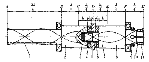 为了不破坏主轴系统的谐振状态,应将固定主轴用的轴承安置在波节(即振幅恒等于零的驻点)处,而将钻头安装在波腹(振幅最大点)处,以便使钻头获得较大的振幅。