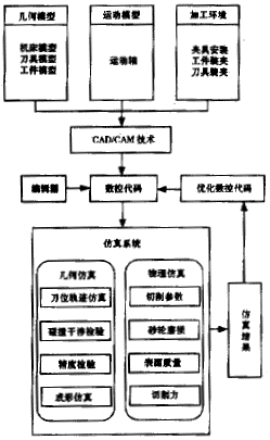 通过对特种回转面刀具磨削加工过程中的各种操作进行模拟与预测,我们建立了面向虚拟制造的特种回转面刀具磨削加工仿真系统。该仿真系统包括几何仿真与物理仿真两方面的内容:几何仿真包括刀位轨迹验证、工件与机床、刀具的碰撞干涉、精度检验、加工过程成形仿真等;物理仿真包括对切削参数的优化、砂轮磨损的监控、表面质量和切削力的控制等。通过将几何仿真与实际加工过程中的物理仿真相结合,能更加真实地反映数控磨削加工特种回转面刀具的实际情况,达到更为精确的仿真效果。仿真系统的结构如图1所示。